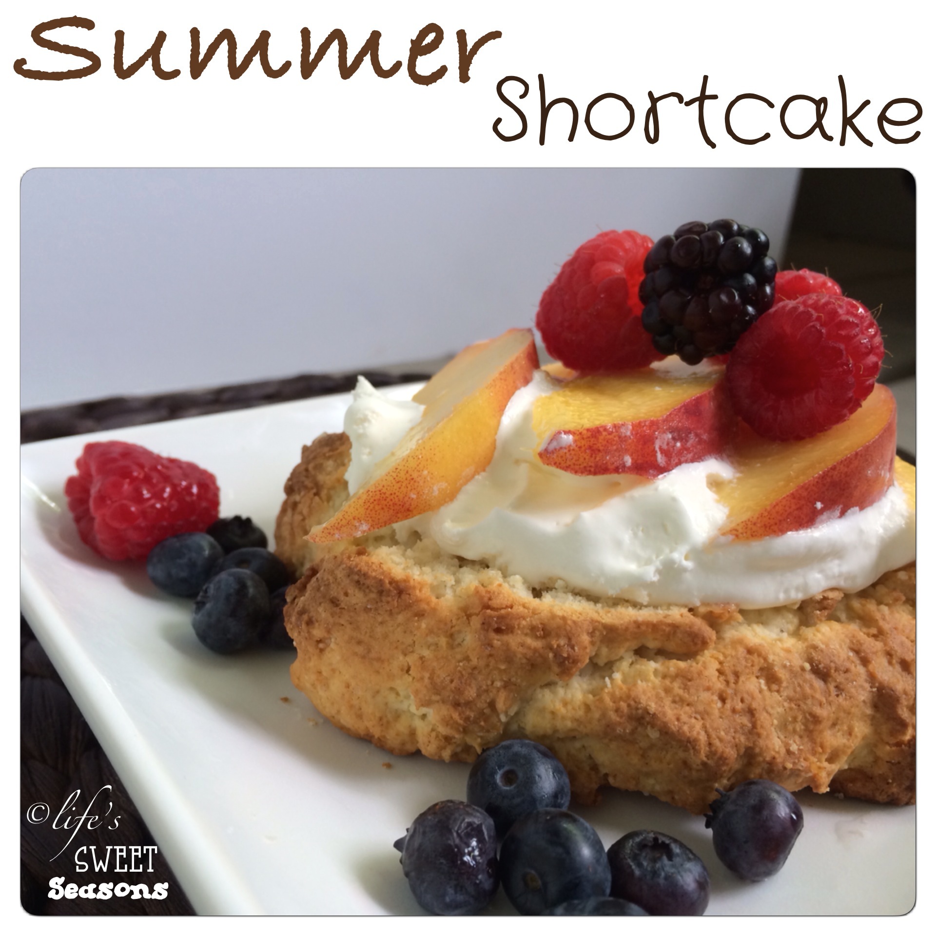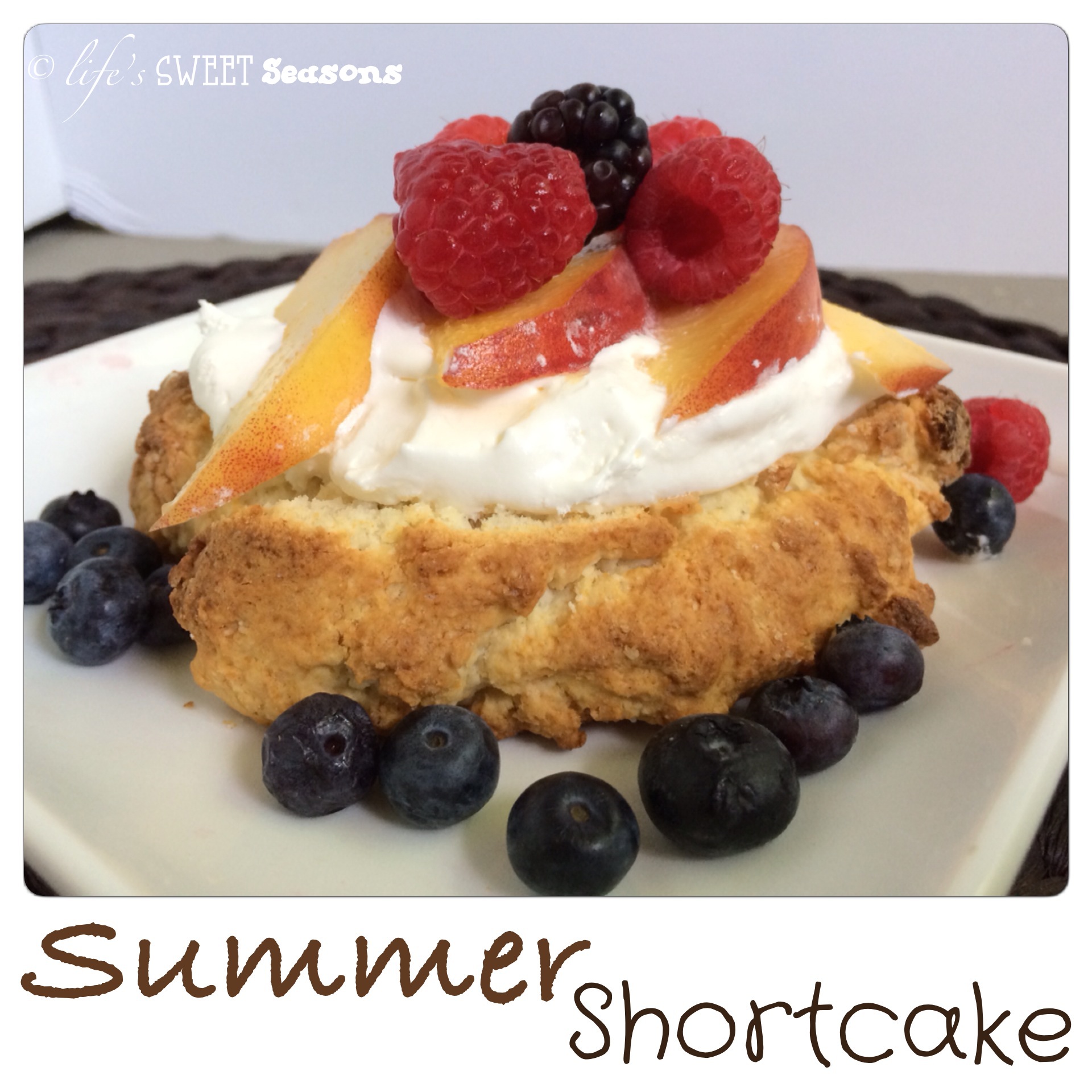 - Split the shortcakes in half and cover with a generous spoonful of Cool Whip. Arrange sliced peaches on top. Add blueberries, blackberries, and raspberries to the shortcake.