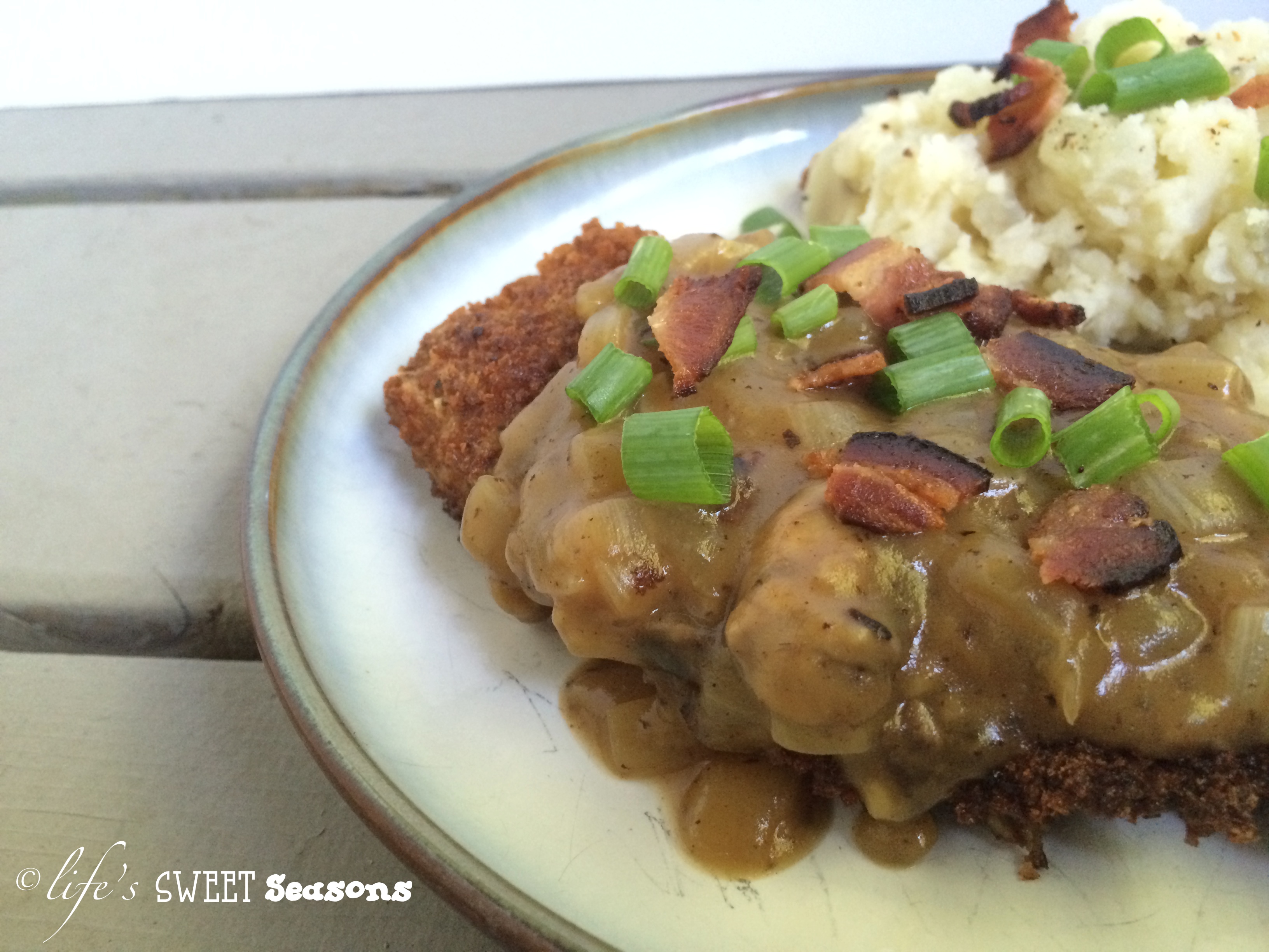 - To serve, cover chicken with mushroom gravy, sprinkle with bacon pieces and green onions.