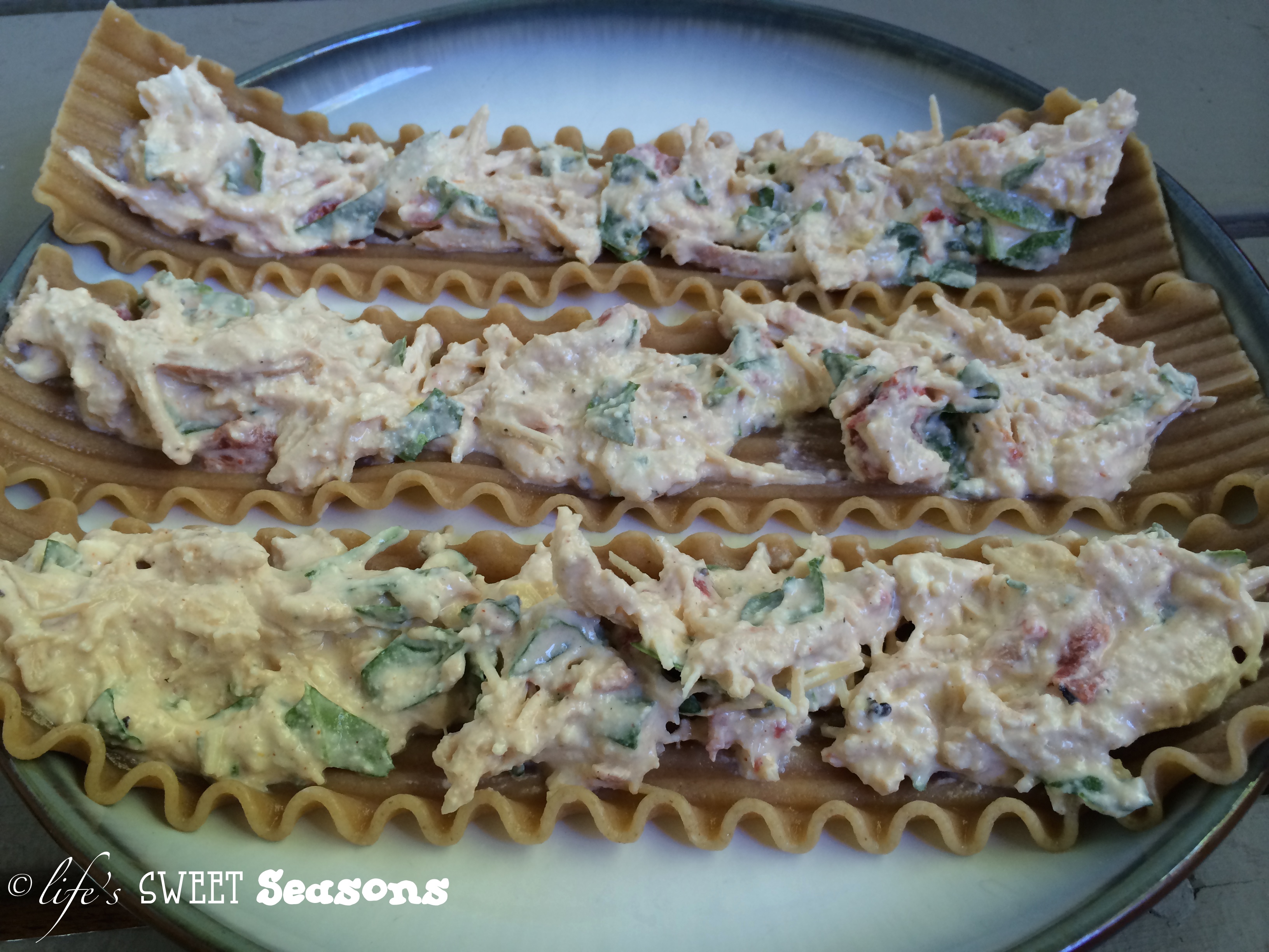 - Assemble lasagna roll-ups by spooning filling onto the full length of each noodle.