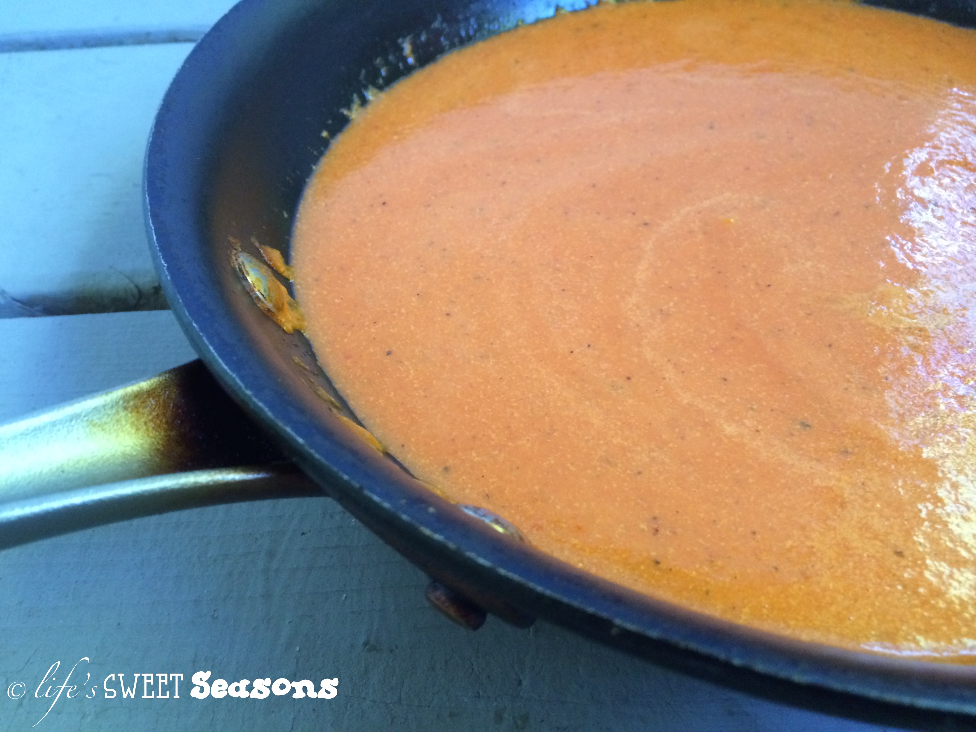 - Add roasted red pepper and tomatoes. Cook for another couple minutes until sauce is warmed through. Blend all ingredients in a blender and return to skillet. Add 1 cup of milk to sauce, stir, and turn down to low while you make filling.