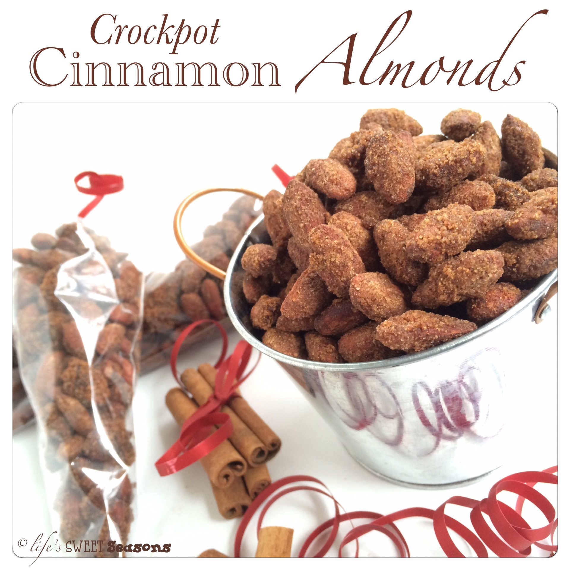 Well, I’ve made these several times now and unfortunately the whole “fix it and forget about it” phrase that I always attach to crockpots does not apply to this recipe. These actually take quite a while to make and sadly, you cannot forget about them because if they aren’t stirred occasionally (meaning every twenty minutes the first couple hours and every ten the last) they will burn. The good news is that all the recipes that I’ve seen for these almonds say that you need to cook them for a full three hours in the crockpot, but I’ve cut it back to two and a half and they still turn out amazing. I’m not even sure who to credit for this recipe because it’s found in a ton of places online, but nearly all the versions are the same. I’ve changed a few things about this recipe other than just the cooking time, such as the ratios of sugar, salt, and almonds. I cut back on the amount of sugar because there’s always so much left over that hasn’t been attached to the almonds. Even now, with the recipe as I’ve written it there’s a ton left over so it’s possible it could still be reduced. I increased the salt as per my husband’s request and as usual, he was right. I’ve increased the number of almonds because it seems sad to go to all that work and not have as many cinnamon and sugar coated, crunchy almonds as possible when you’re finished.
