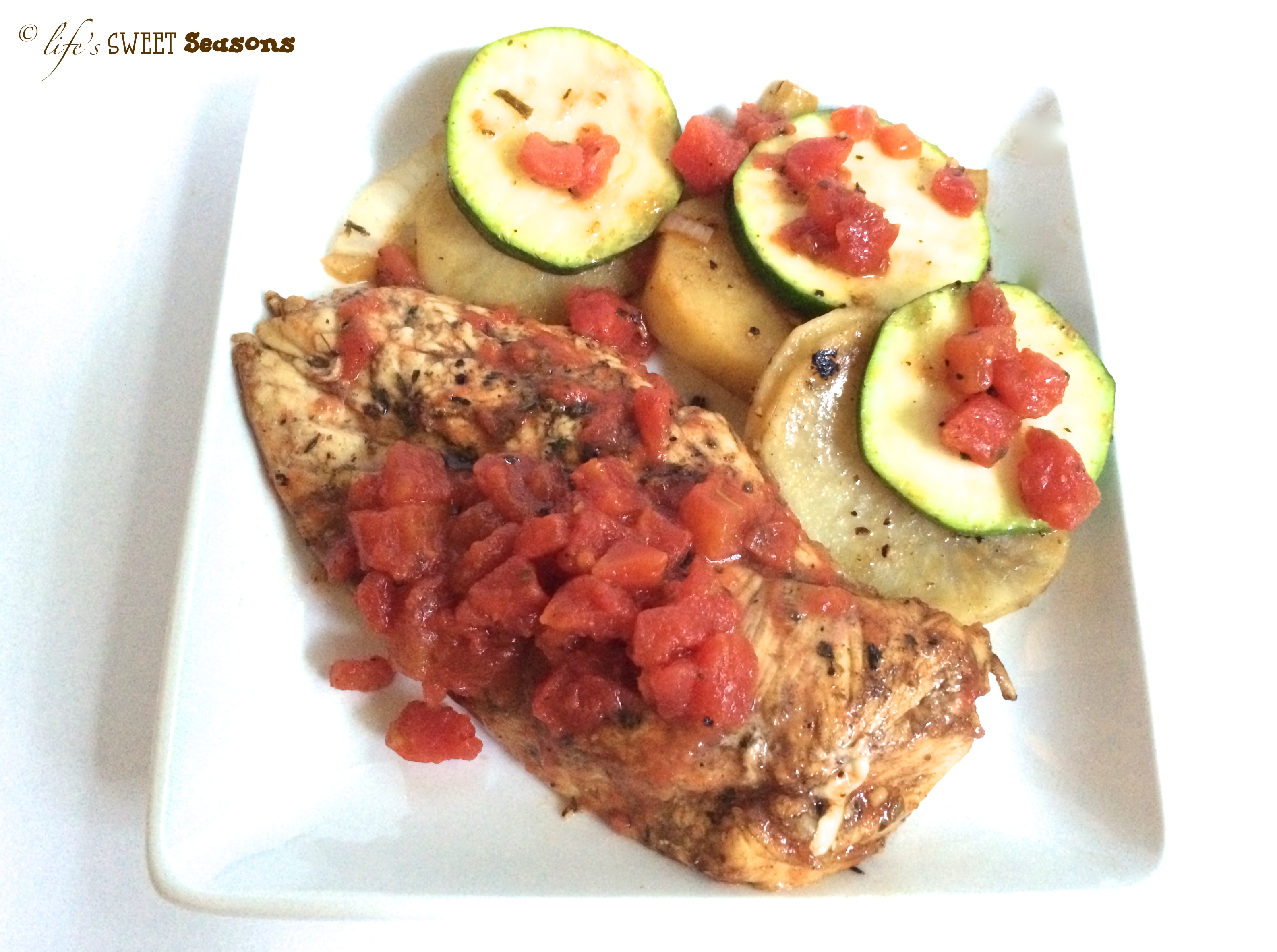I originally got this recipe out of a Rachel Ray cookbook. This is one of our favorite weeknight meals because it’s fairly quick and afterwards I only have to wash one pan. Since first making it I’ve made a few changes to the original recipe. Rachel Ray uses a large can of crushed tomatoes, but I found that this made the dish seem overpowered by tomato and taste too much like spaghetti (or at least just enough that you wouldn’t want to have both dishes in the same week.) I love the combination of vegetables in this dish too but the crushed tomatoes seemed to take away from the flavor of the different vegetables and it was easy for them to quickly become too mushy for our liking. Using diced tomatoes rather than crushed allows the juices to continue to cook the chicken and vegetables, but allows the vegetables to maintain their own distinct flavors. It may sound a bit silly, but I prefer the way it looks on the plate too because you have a chicken breast and a side of vegetables rather than a mess of crushed tomatoes hiding food underneath. Another change I made was to use a spicy Montreal steak seasoning as opposed to original, which obviously gives this a kick. If you don’t like heat, by all means use the original and I’m sure it’ll still be tasty.