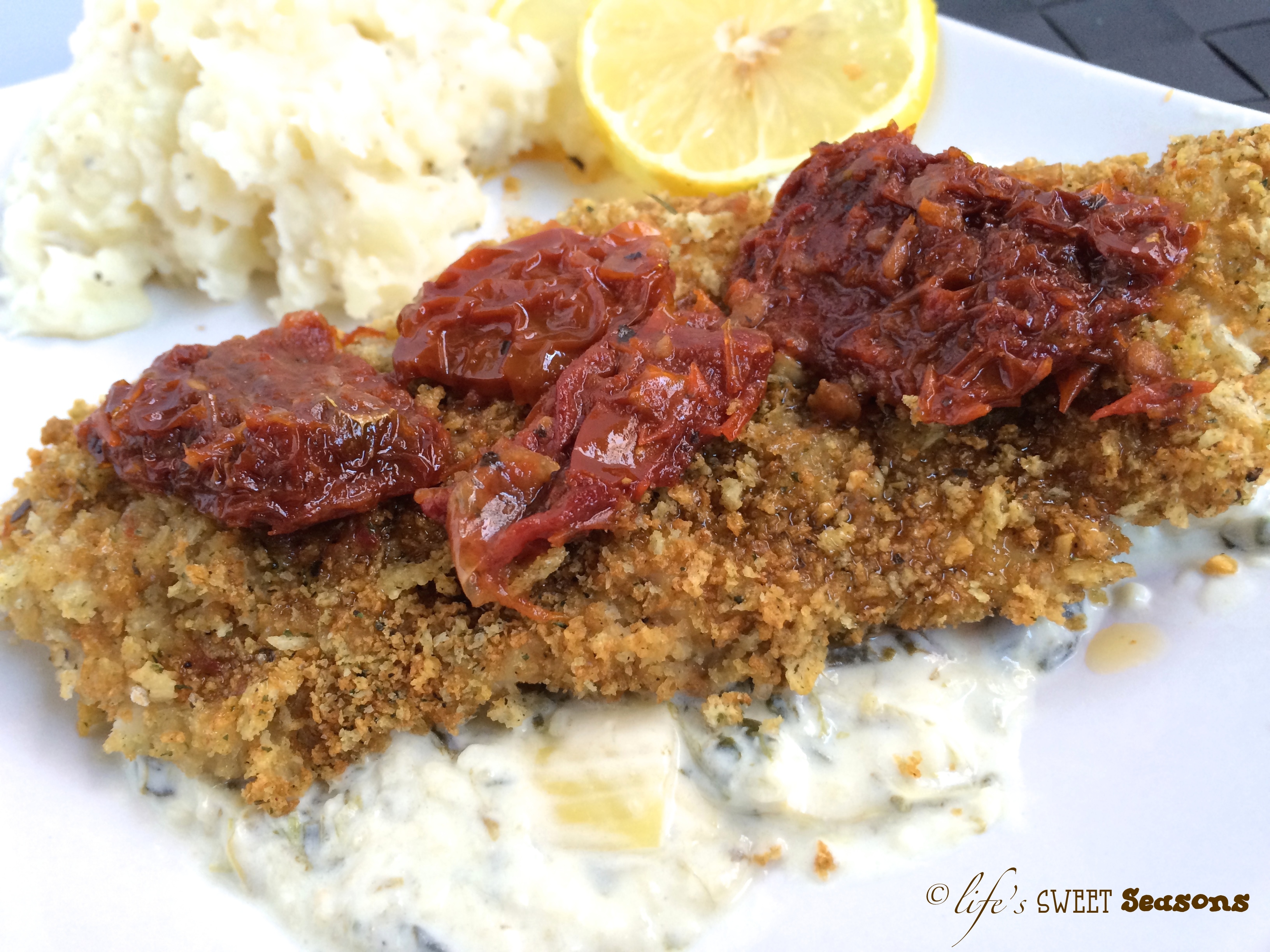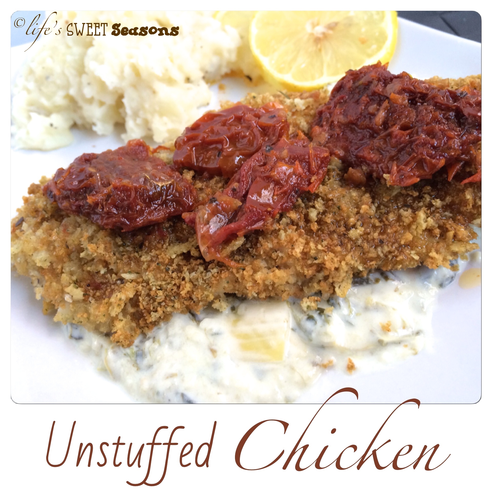 I know my version of this dish isn’t entirely accurate, but it’s delicious nevertheless. In the original recipe they used a creamed spinach and artichoke sauce which was slightly thinner than a typical spinach artichoke dip, but after I tried it I immediately thought, “Yup, spinach artichoke dip will work!” I love the idea of using regular spinach artichoke dip because you can enjoy it beforehand as an appetizer the day before and then use leftovers for dinner the next day. That way you enjoy it more than once and your job is easier the next night because you’ve already prepped. 🙂 I adjusted a version I found on food.com after reading reviews and looking at other variations. Use your favorite! Another change is that the one I had at the restaurant was a stuffed chicken breast. Honestly, I’m always nervous about cooking a stuffed chicken breast all the way and my little family can’t eat that much at one time anyway. It was easier for me to bake the chicken solo and then serve it on a bed of spinach artichoke dip and then top the whole thing with a lemon butter sun-dried tomato sauce. Thus the title, “Unstuffed Chicken.” The other thing that I changed is that the original was marinated chicken breast and I breaded mine. I would say that if you choose to marinate it, it should be in a lemon herb marinade. Pick your pleasure, it’s good either way. After making this the first time at home it was an instant family favorite. I hope you enjoy it too.