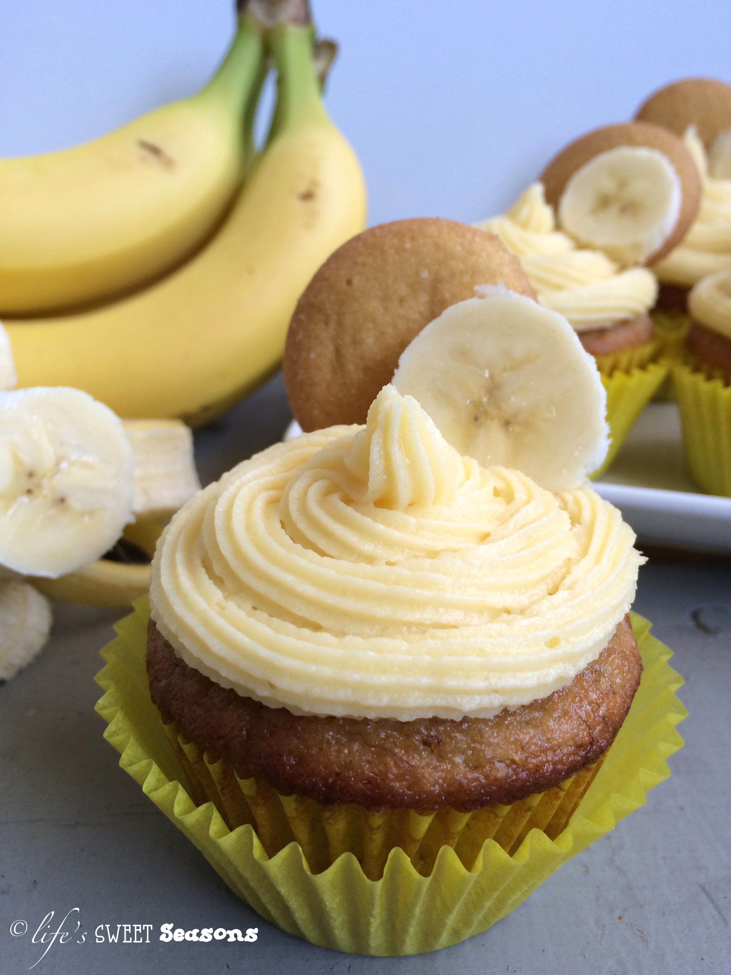 Cupcake recipe from Cooking Classy, Banana Cream Cheese Frosting recipe by Life’s Sweet Seasons