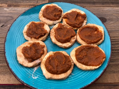Dip each biscuit in the sugar, cinnamon, and pumpkin spice mixture. Flip to coat both sides. Or if your kiddos are volunteering to help you, you can pour your sugar goodness into a bag and let them shake biscuits in groups of three to coat. Reassemble biscuits on a plate and add about 1 tablespoon of the pumpkin mixture on top of each biscuit.