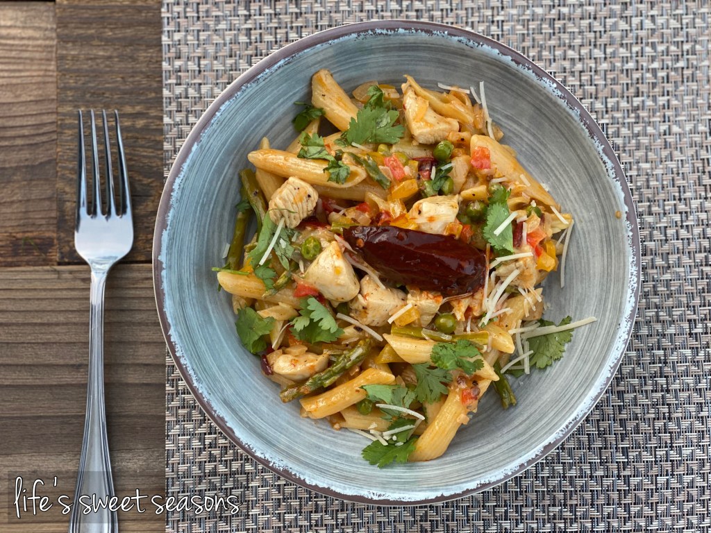 This recipe has more steps than your usual pasta dish, but it’s worth it! The addition of asparagus and peas gives a sweet, crunchy contrast to the spicy sauce. My family loves the smoky chipotle kick, but if yours tends to like a milder flavor you can easily add one chipotle instead of two, or cut them both out altogether and just add the two tablespoons of adobo sauce. Be sure to add the fresh cilantro on top along with the Parmesan cheese at the end. YUM!
