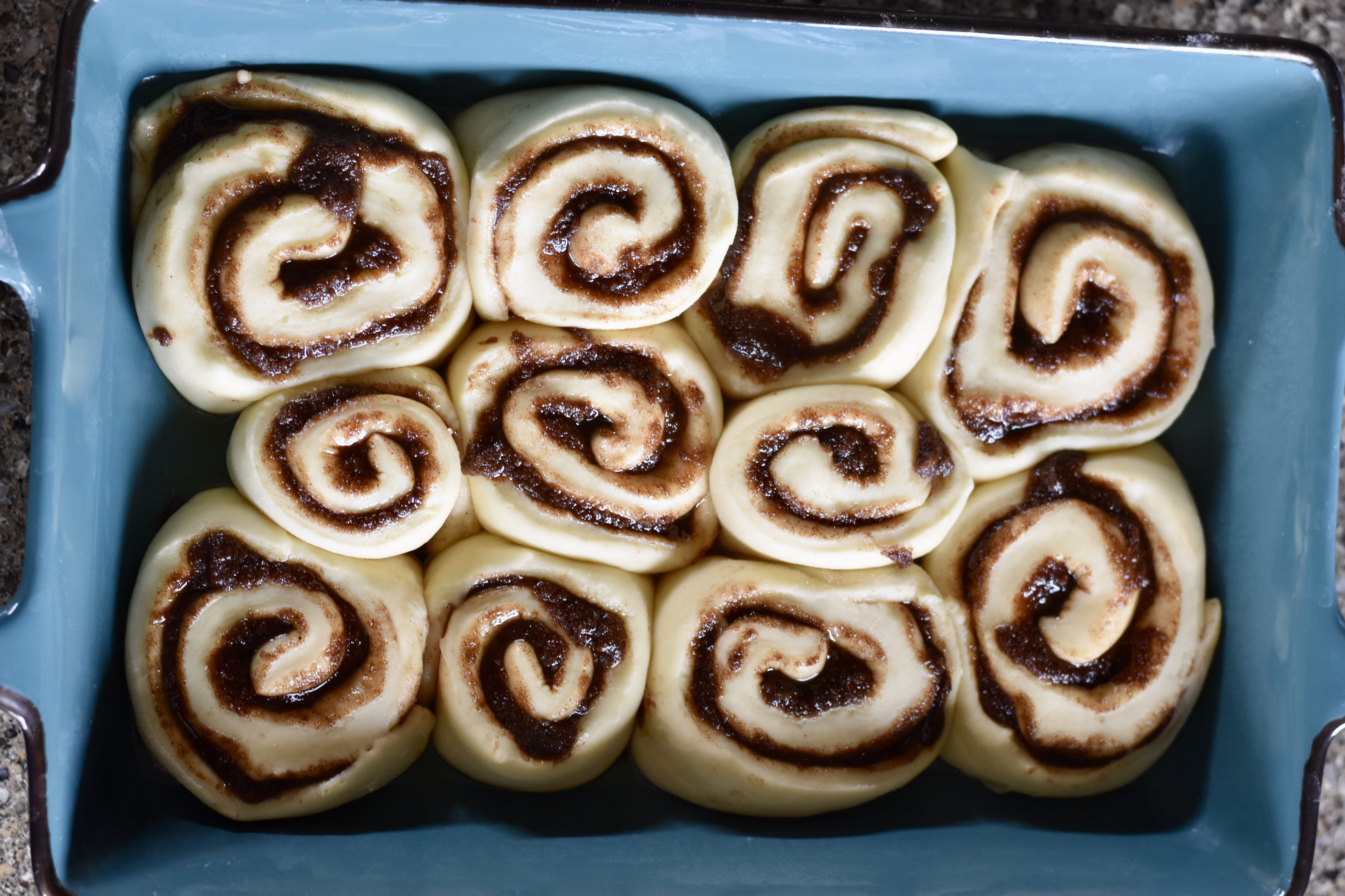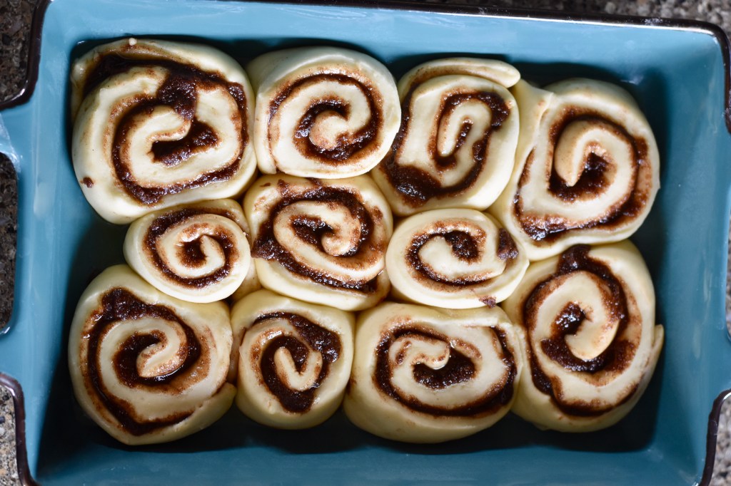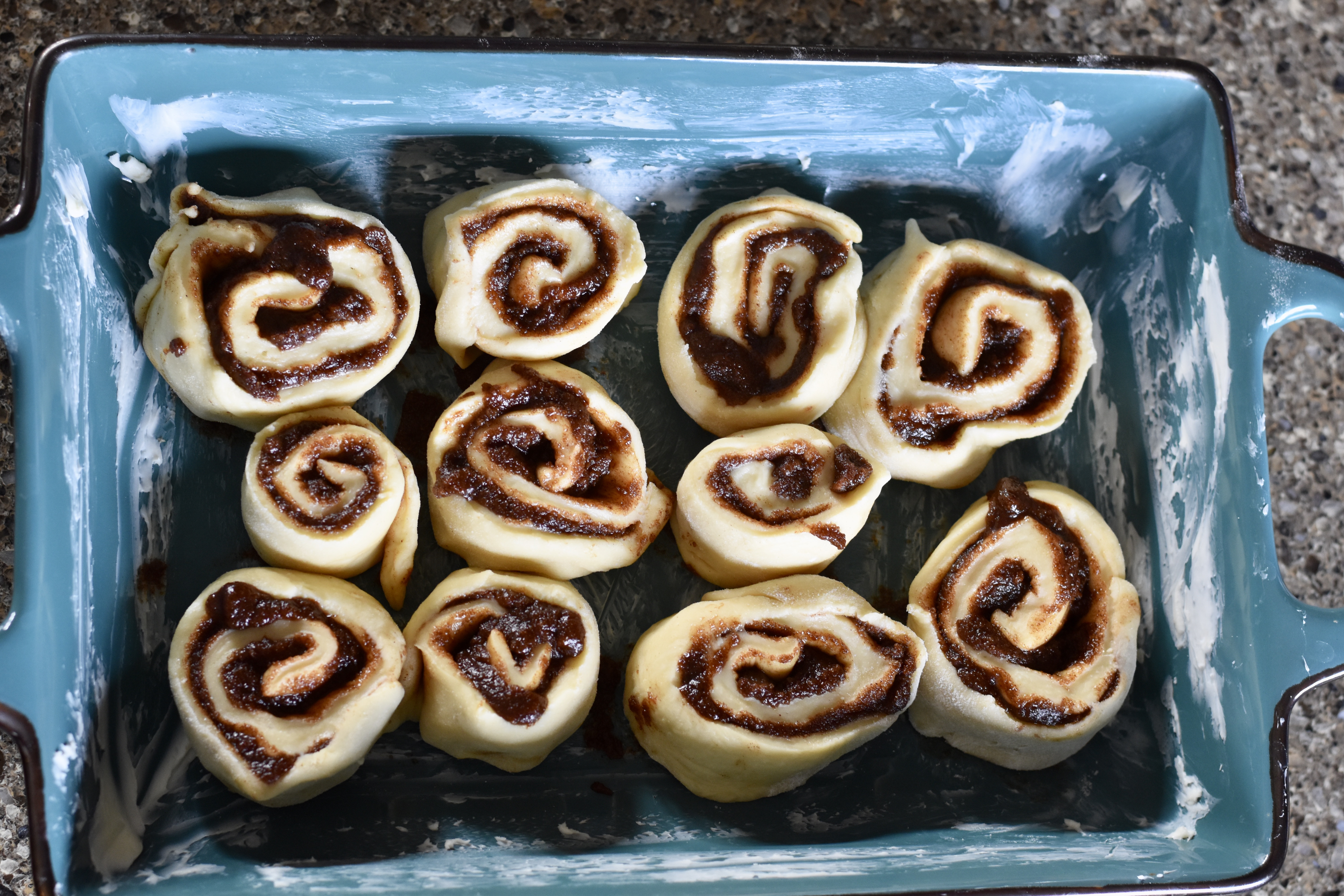 - Butter a 9×17 baking dish. Take out the dough, but turn the oven back on to its lowest setting. Using a rolling pin, roll dough into a rectangle. Spread the cinnamon mixture on top leaving a slight border. Roll into a loose log. Cut into 12 spirals and place in buttered dish.