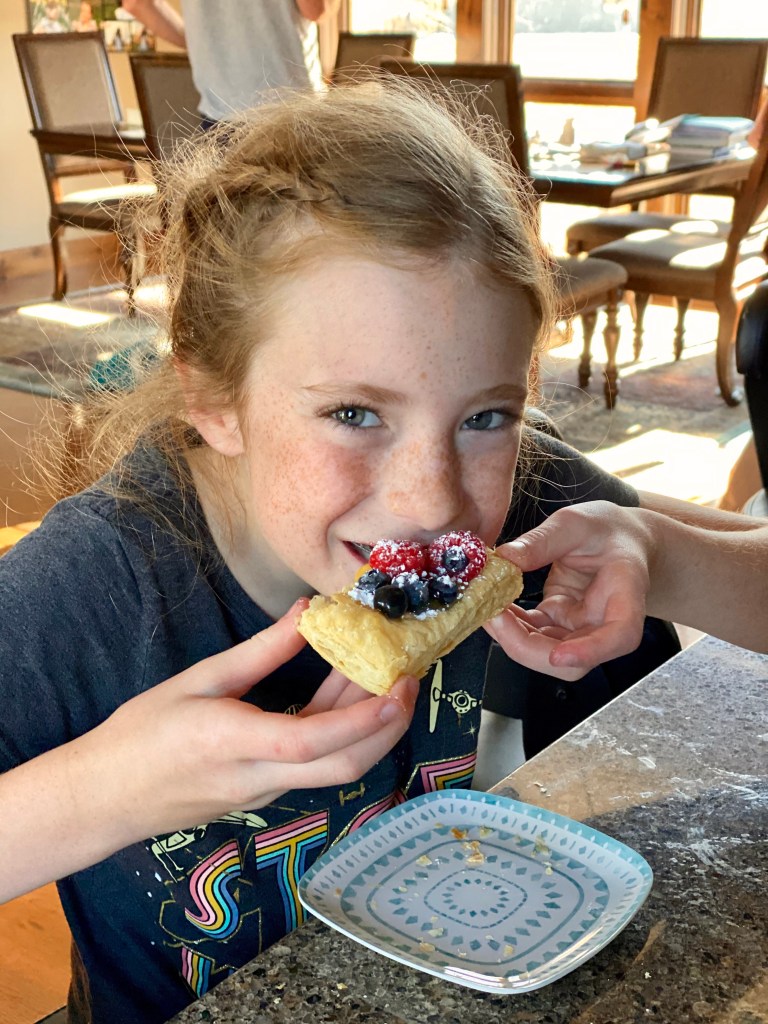We like making food to send with Michael when he works at the clinic. These were fun to make with my daughter Lindsay, and according to Michael, they were were a big hit at the office. These pictures were taken after making 12 pastries out of the two pastry sheets, but we made them a second time and cut each one of those in half to yield 24 pastries, which is definitely the way to go. That way, there’s less dry pastry that lacks the lemon curd and berry goodness, and twice the number of people get to partake! Win-win! These are perfect to make if you’re having people over for brunch or delaying homeschool for the morning in place of some mother-daughter kitchen bonding!