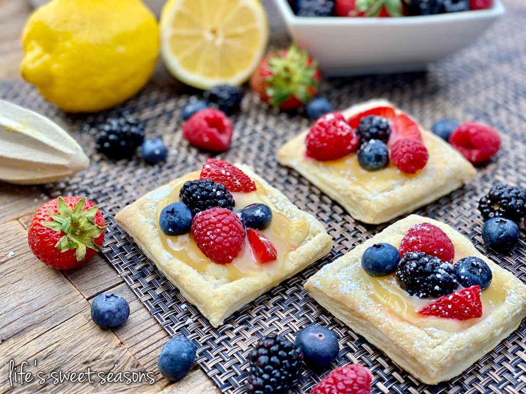 - Divide the lemon curd among the cooled pastries. Top with your desired fresh berries then dust with powdered sugar before serving. We used a fine mesh strainer to dust the powdered sugar. If desired, sprinkle with extra lemon zest for a nice pop of flavor. Keep chilled until ready to serve.